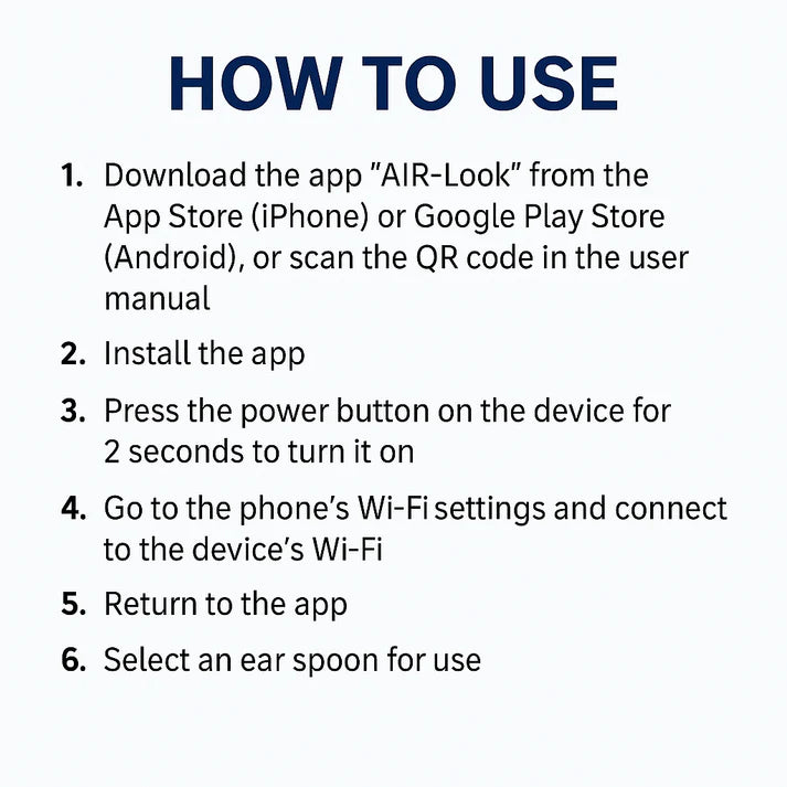 - Download the app “AIR-Look” from the App Store (iPhone) or Google Play Store (Android), or scan the QR code in the user manual.